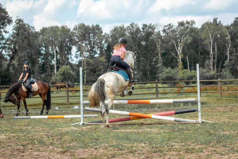 In onze springlessen beginnen we met de basis springtechnieken en trainen we tot een echte springruiter, daarom hebben we ook twee springlessen. In de eerste springles ligt de focus op leren van de juiste houding van zichzelf en van het paard, voor, tijdens en na de sprong. Dit in combinatie met een basis parcour. Heb je dit volledig onder de knie? Dan kan je over naar de tweede les! Hier leren de ruiters al wat technischer springen en rijden ze wat hogere parcours.